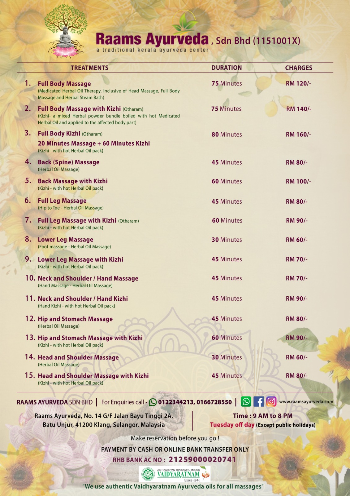 Raams Ayurveda formerly known as Ayurveda Healing Touch Center Take a few hours and visit us - or even a whole day - to refresh yourself, recover, and rejuvenate at our facility. Let our friendly therapists pamper with their 12-year experience.